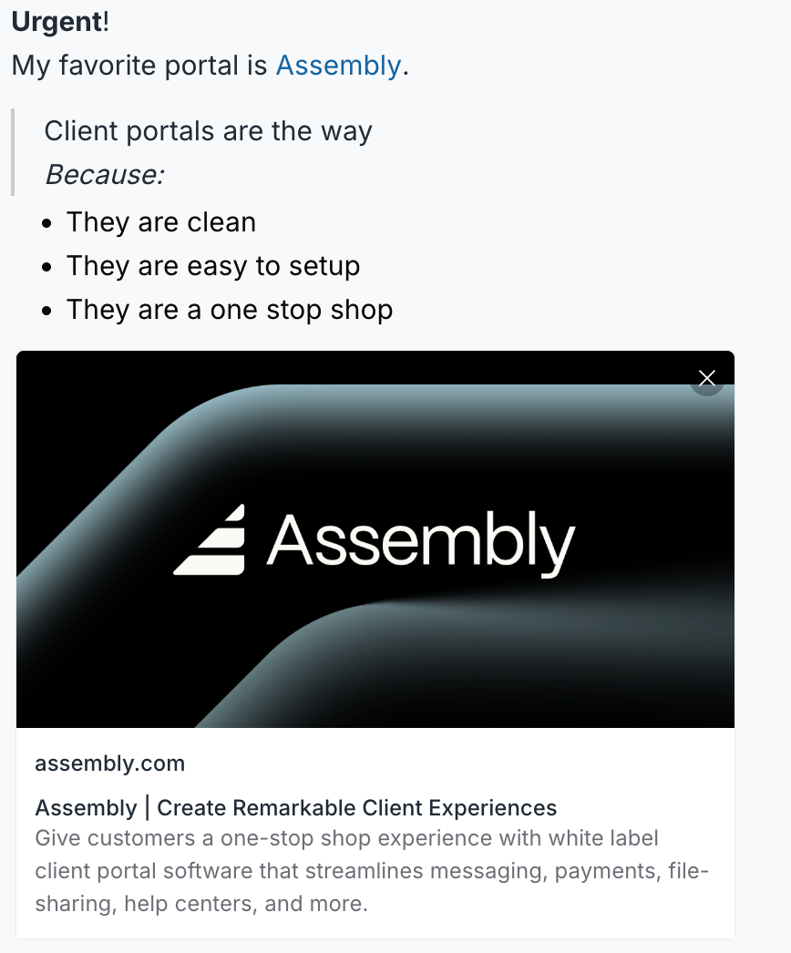 "text": "**Urgent**!\n My favorite portal is [Assembly](https://assembly.com). \n> Client portals are the way \n\n Because: \n* They are clean \n* They are easy to setup \n* They are a one stop shop"